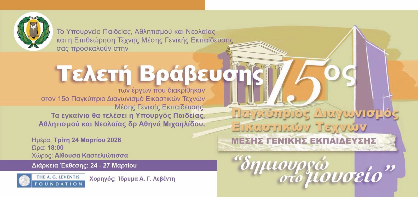 Με ιδιαίτερη χαρά και περηφάνια ανακοινώνουμε τις διακρίσεις που έλαβαν έργα μαθητριών του σχολείου μας στο πλαίσιο του 15ου Παγκύπριου Διαγωνισμού Εικαστικών Τεχνών Μέσης Γενικής Εκπαίδευσης.